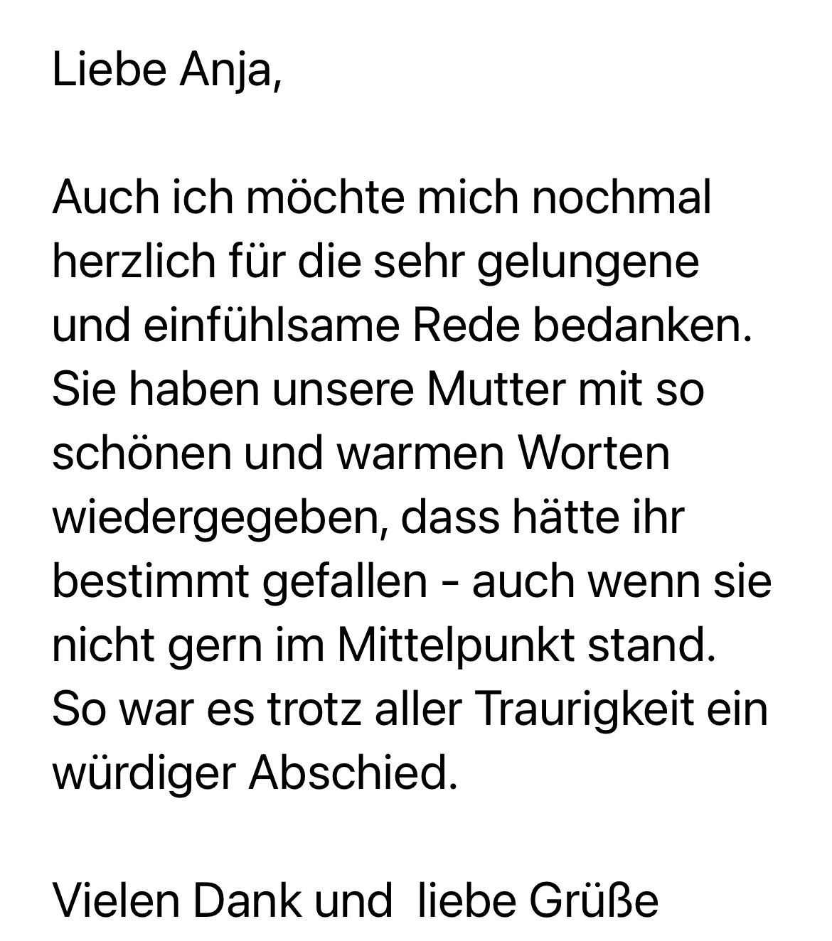 Ich bin immer noch ganz beeindruckt von Ihrer Rede und dem Ablauf der Seebestattung. Von Ihrer Muschel-Idee an Bord war ich sehr angetan und die Trauergäste haben es sehr geschätzt. Ich bin so froh, dass ich Sie gefunden habe und Sie sich darauf eingelassen haben."